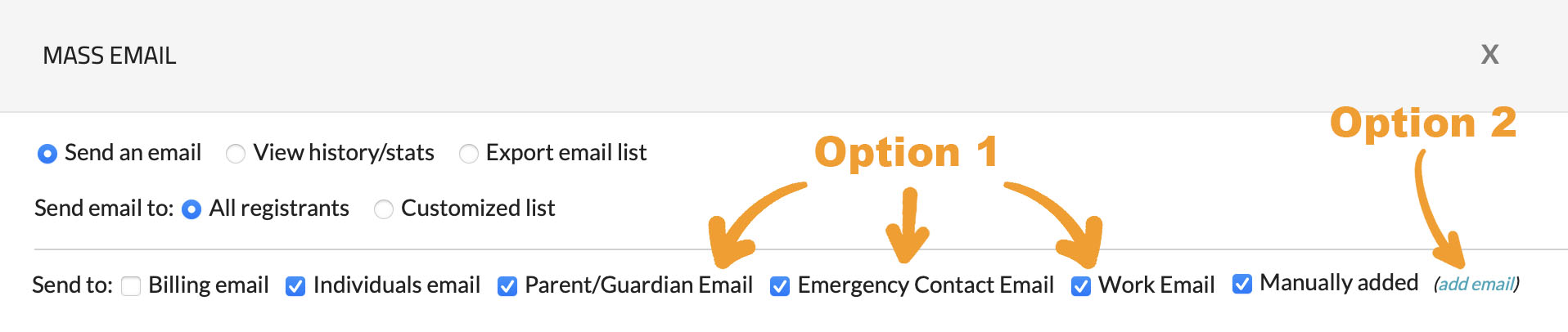 Option 2: Within the Mass Email popup, you can click the “Add Email” link to add additional email addresses that aren’t in your registrant list. This can be used for people who want to receive your communications but aren’t directly registered, such as parents, etc.