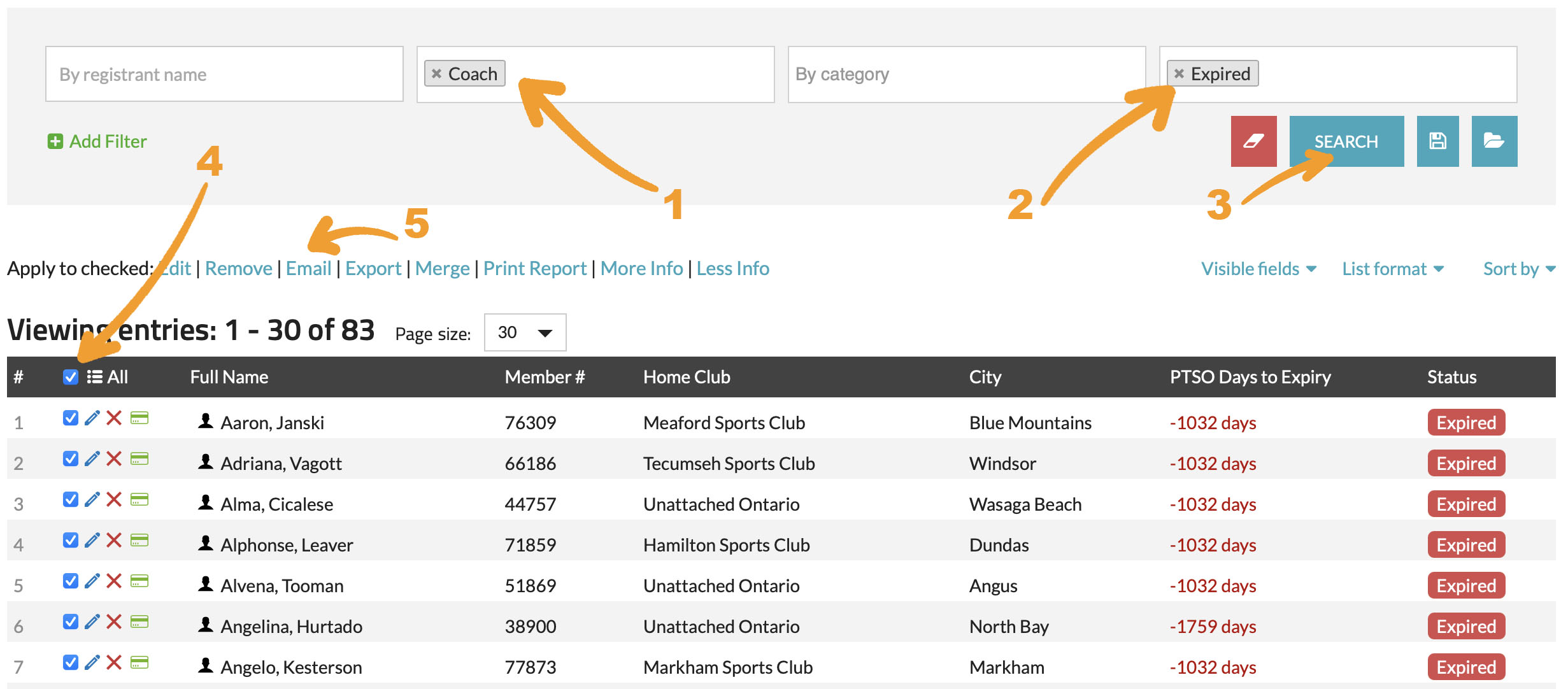Not every message needs to go to everyone. Our Mass Email feature allows you to filter and target specific recipients from your View Registrants page — for example, only athletes, coaches, parents, or volunteers. You can also filter by any information you collect from your registrants — such as registration date, membership type, age category, club, or custom form questions.
