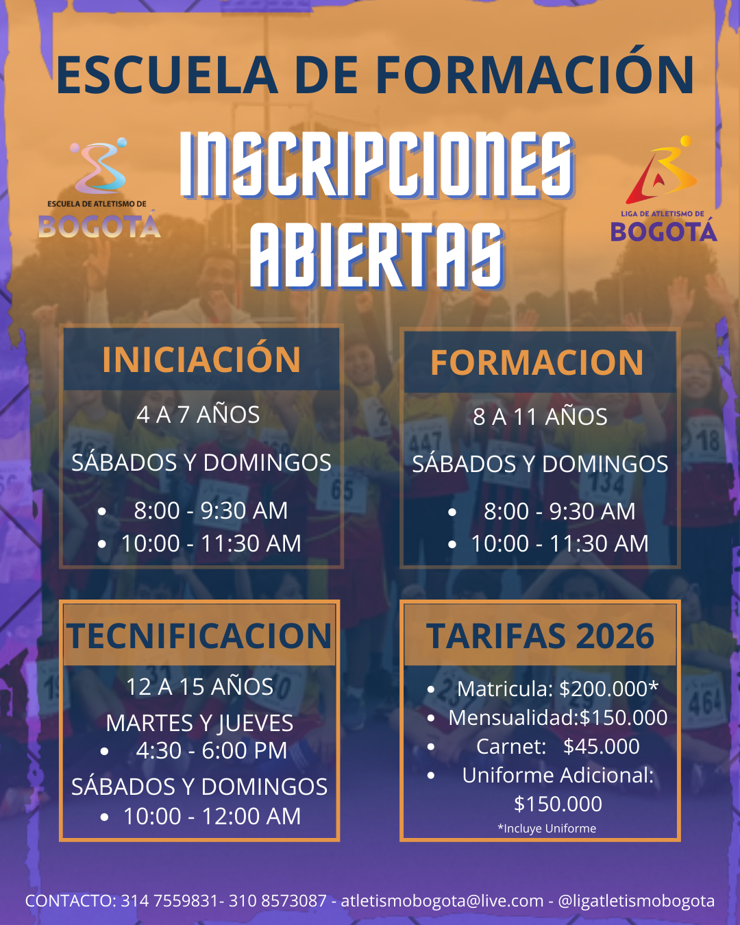 La Liga de Atletismo de Bogotá invita a niños, niñas y jóvenes a formar parte de su Escuela de Formación Deportiva, un espacio donde el atletismo se vive con disciplina, aprendizaje y pasión, guiados por entrenadores calificados.